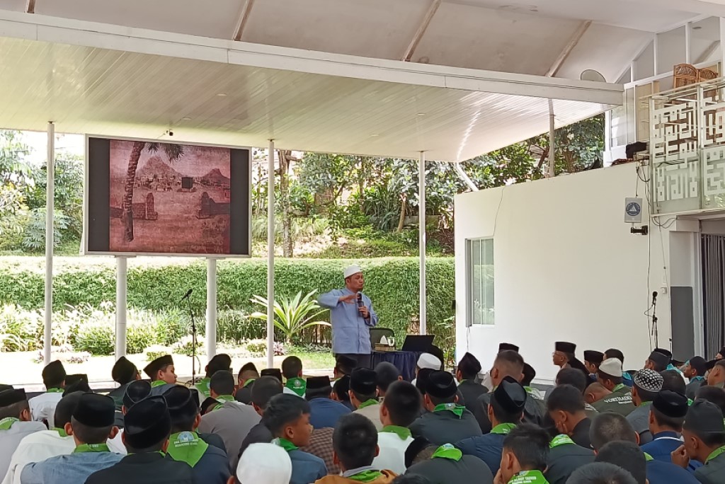 Potret santri SMA DTBS Putra praktik dialog dengan bahasa inggris saat momentum Halaqoh Bahasa bersama Native Speaker (8/5/2025) di Lantai Utama Masjid Rahmatan Lil’aalamiin, Eco Pesantren 1 Daarut Tauhiid.