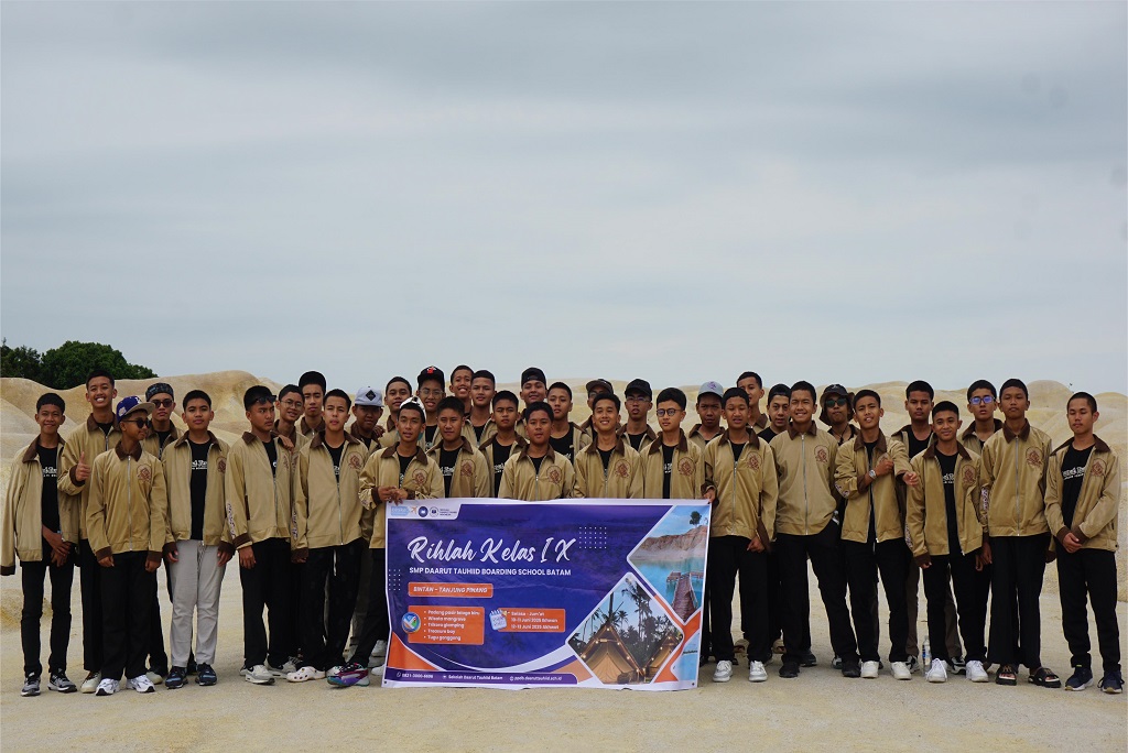 Potret kegiatan rihlah santri ikhwan kelas IX SMP Daarut Tauhiid Boarding School (DTBS) Batam yang berlangsung di beberapa destinasi seperti Padang Pasir Telaga Biru, wisata Mangrove, Trikora Glamping, Treasure Bay, dan Tugu Gonggong, pada Selasa (10/6) hingga Rabu (11/6).