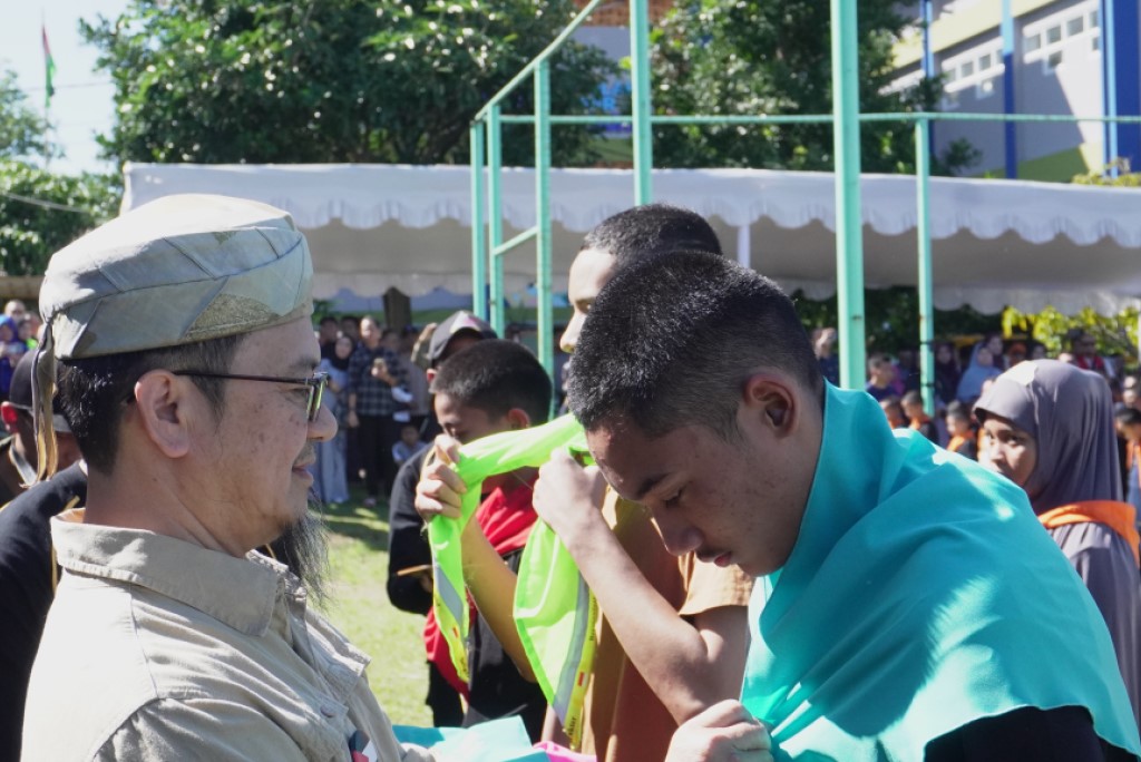Potret penyematan syal Boarding School oleh pembina Pesantren Daarut Tauhiid kepada perwakilan santri SMK DTBS saat momentum penutupan Mataba (19/7/2025) di Sport Center Eco Pesantren 1 Daarut Tauhiid.
