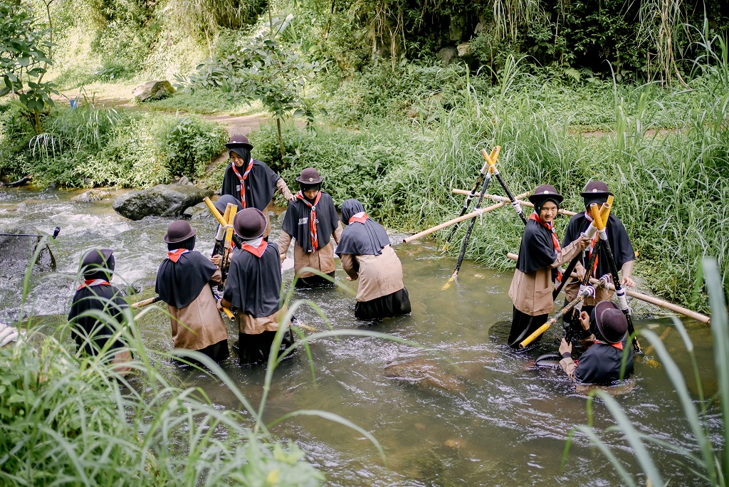Potret saat santri SMP Daarut Tauhiid Boarding School (DTBS) Putri mengikuti kegiatan Gladi Tangguh PASINKA (Perkemahan Pasukan Inti Pramuka) di Curug Tilu Leuwi Opat, pada Senin-Rabu (19-21/1/2026).