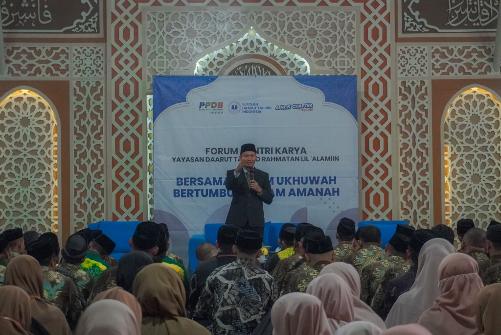 Potret pengarahan ketua Yayasan Daarut Tauhiid Rahmatan Lil’alamiin (YDTR), Gatot Kunta Kumara saat Forum Santri Karya pada (22/12/2025) di Aula Arofah SMP DTBS Putri.