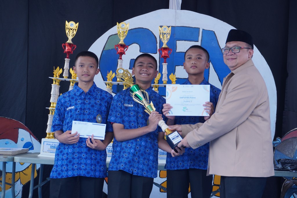 Potret santri SMP DTBS Putra menerima piala penghargaan Juara 2 Lomba LCC saat penutupan Generasi Prestasi (GenPres) pada (13/10/2025) di Lapangan Eco Pesantren 1 Daarut Tauhiid.