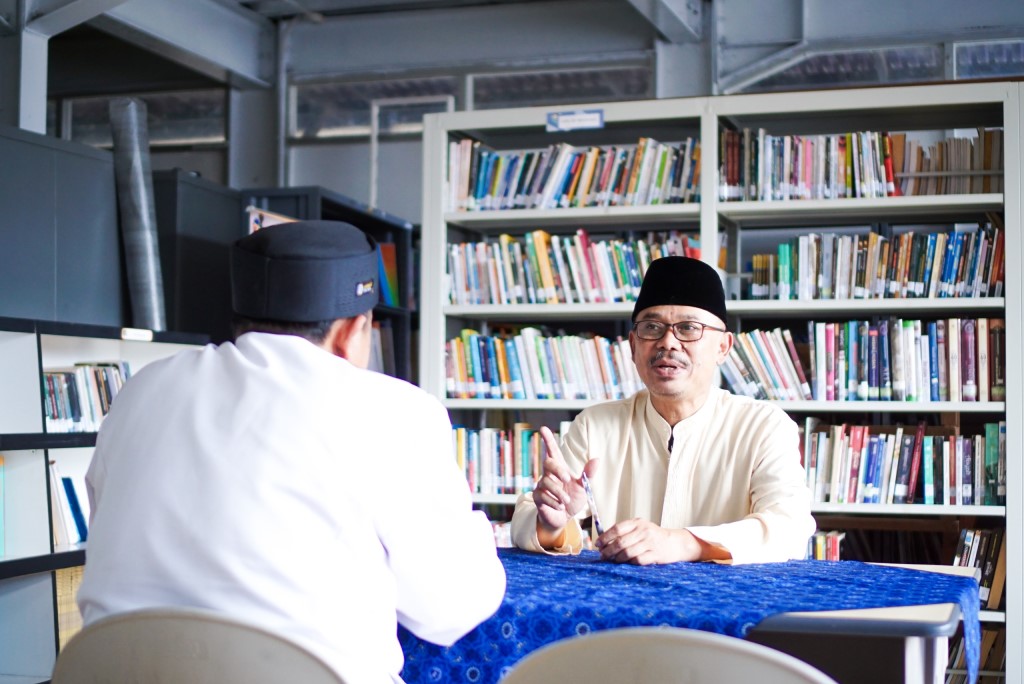 Potret pengawas sedang mewawancarai salah satu civitas saat kegiatan Visitasi PKKS pada (31/10/2025) di Perpustakaan SMP DTBS Putra.