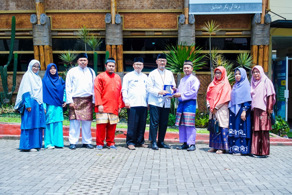 Potret penyerahan cindera mata dari JSIT (Jaringan Sekolah Islam Terpadu) Kabupaten Bintan, Kepulauan Riau kepada Sekolah Daarut Tauhiid Indonesia (SDTI) saat kegiatan Studi Tiru pada (16/10/2025) di Gedung Abu Bakar, Kawasan Eco Pesantren 1 Daarut Tauhiid.