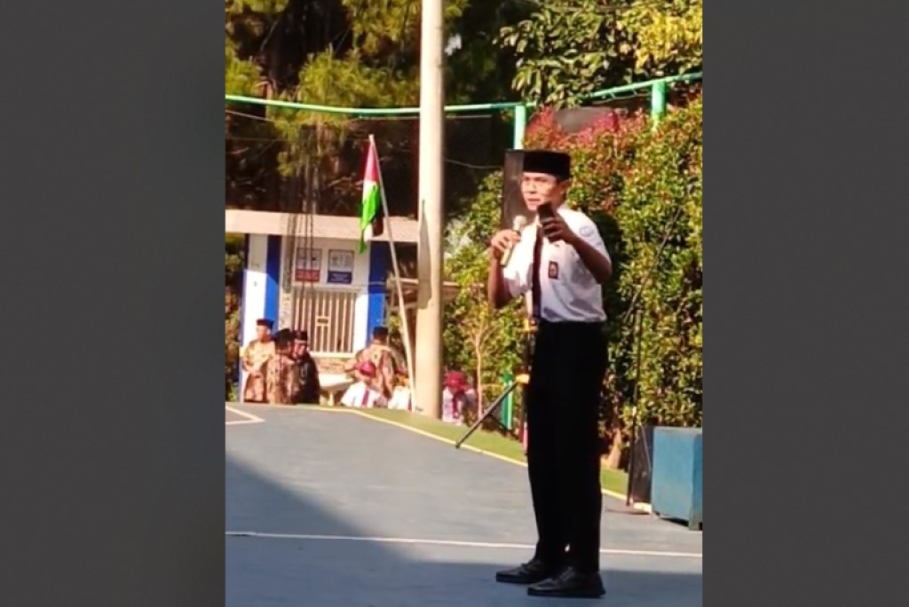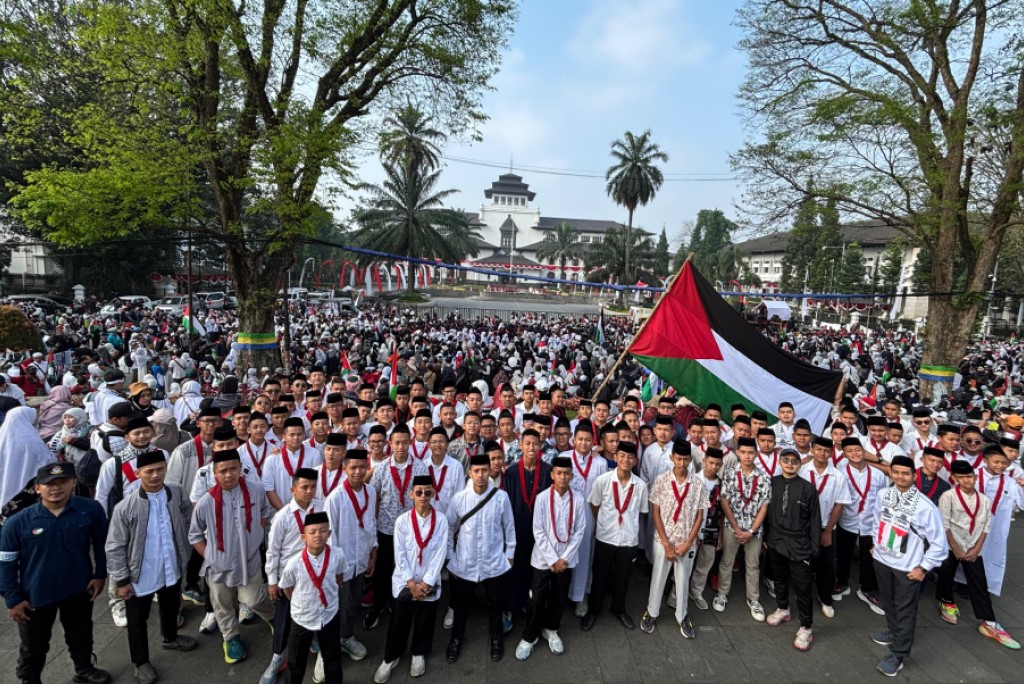 Potret perwakilan santri SMP DTBS Putra mengikuti Aksi Bela Palestina pada (24/8/2025) di Gedung Sate, Kota Bandung.