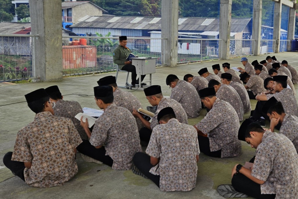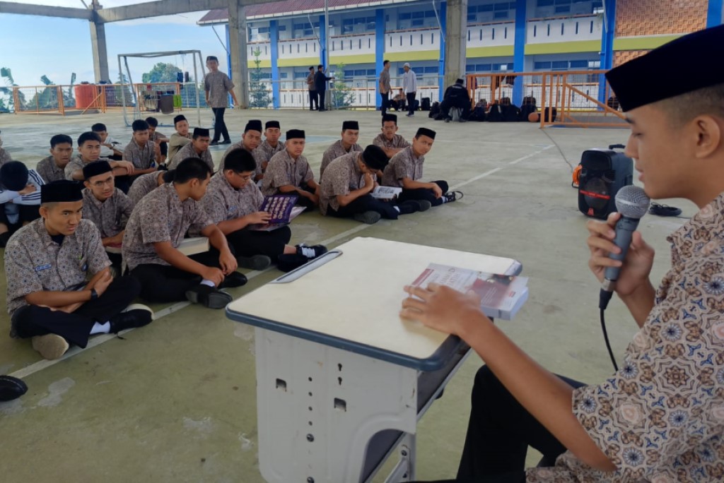 Potret salah satu santri sedang berbagi hikmah dari isi buku yang ia baca saat momentum KALIBER (Kamis Literasi Bersama) pada (21/8/2025) di Dome Eco Pesantren 1 Daarut Tauhiid.