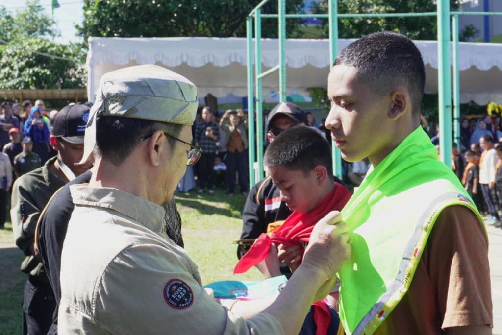 Potret penyematan syal Boarding School oleh pembina Pesantren Daarut Tauhiid kepada perwakilan santri SMP DTBS Putra saat momentum penutupan Mataba (19/7/2025) di Sport Center Eco Pesantren 1 Daarut Tauhiid.