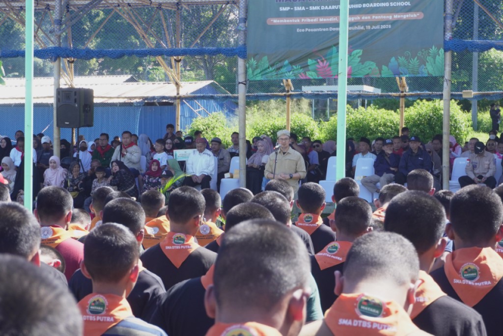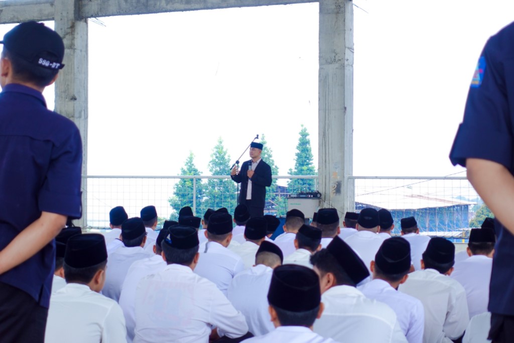 Potret seluruh santri Ikhwan Sekolah DT Bandung mengikuti pengarahan dari SSG (Santri Siap Guna) perihal teknis pelaksanaan Mataba pada (14/7/2025) di Dome Eco Pesantren 1 Daarut Tauhiid.