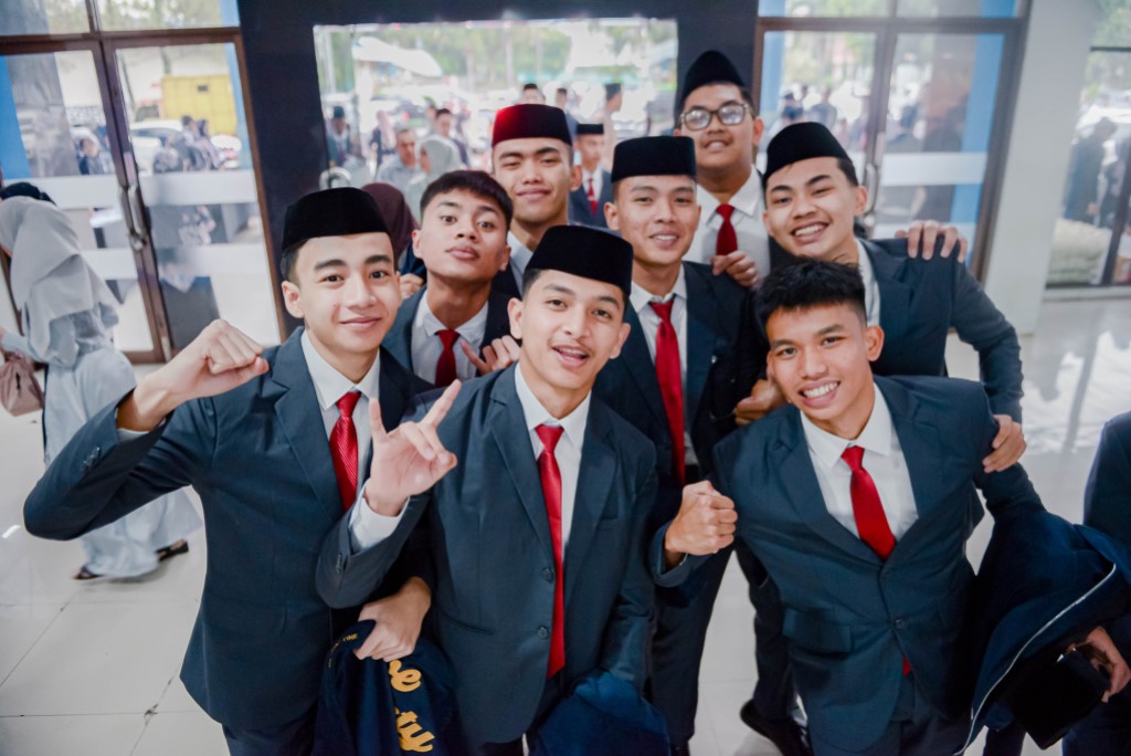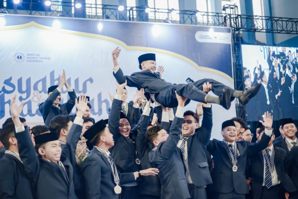 Potret kebersamaan lulusan SMA DTBS Putra saat momentum Tasyakur dan Muhasabah Sekolah Daarut Tauhiid Indonesia pada (19/6/2025) di Gedung Gymnasium UPI, Kota Bandung.