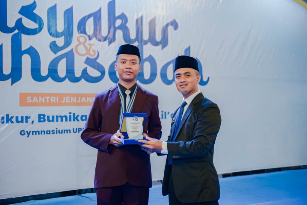 Potret penyerahan penghargaan kepada lulusan berprestasi SMP DTBS Putra saat momentum Tasyakur dan Muhasabah Sekolah Daarut Tauhiid pada (19/6/2025) di Gedung Gymnasium UPI, Kota Bandung.