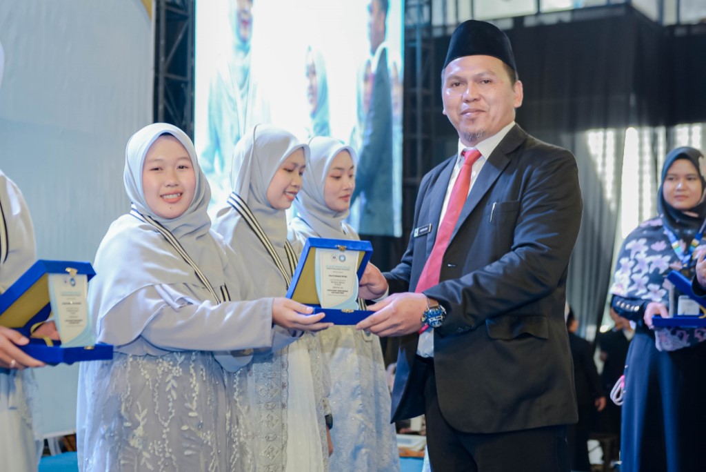 Potret penyerahan plakat penghargaan kepada santriwati berprestasi saat momentum Tasyakur dan Muhasabah Sekolah Daarut Tauhiid Indonesia (19/6/2025) di Gedung Gymnasium UPI, Kota Bandung.