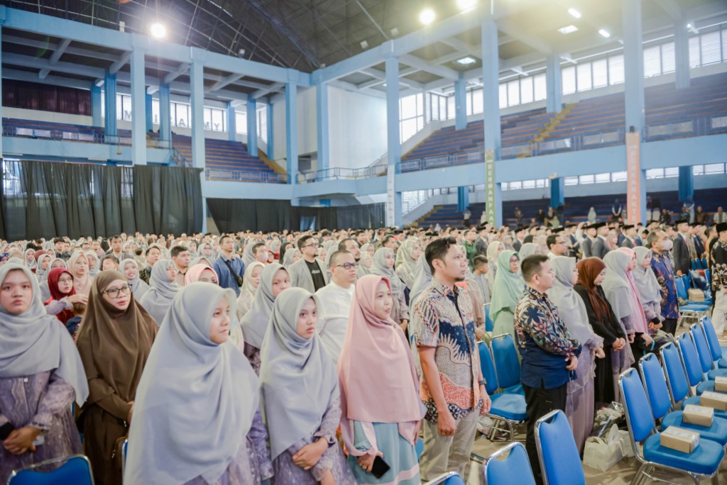 Potret seluruh hadirin menyanyikan lagu Indonesia Raya pada momentum Tasyakur dan Muhasabah Sekolah Daarut Tauhiid Indonesia (19/6/2025) di Gedung Gymnasium Universitas Pendidikan Indonesia (UPI)