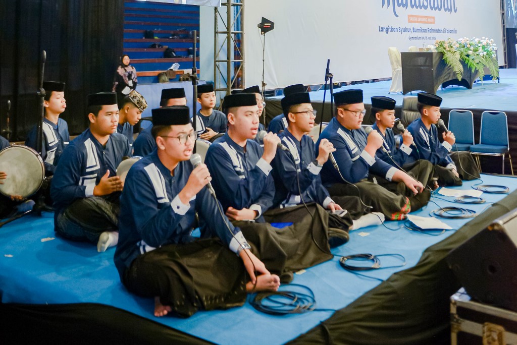 Potret penampilan hadroh oleh perwakilan santri Daarut Tauhiid saat kegiatan Tasyakur dan Muhasabah pada (19/6/2025) di Gedung Gymnasium Universitas Pendidikan Indonesia (UPI), Bandung, Jawa Barat.