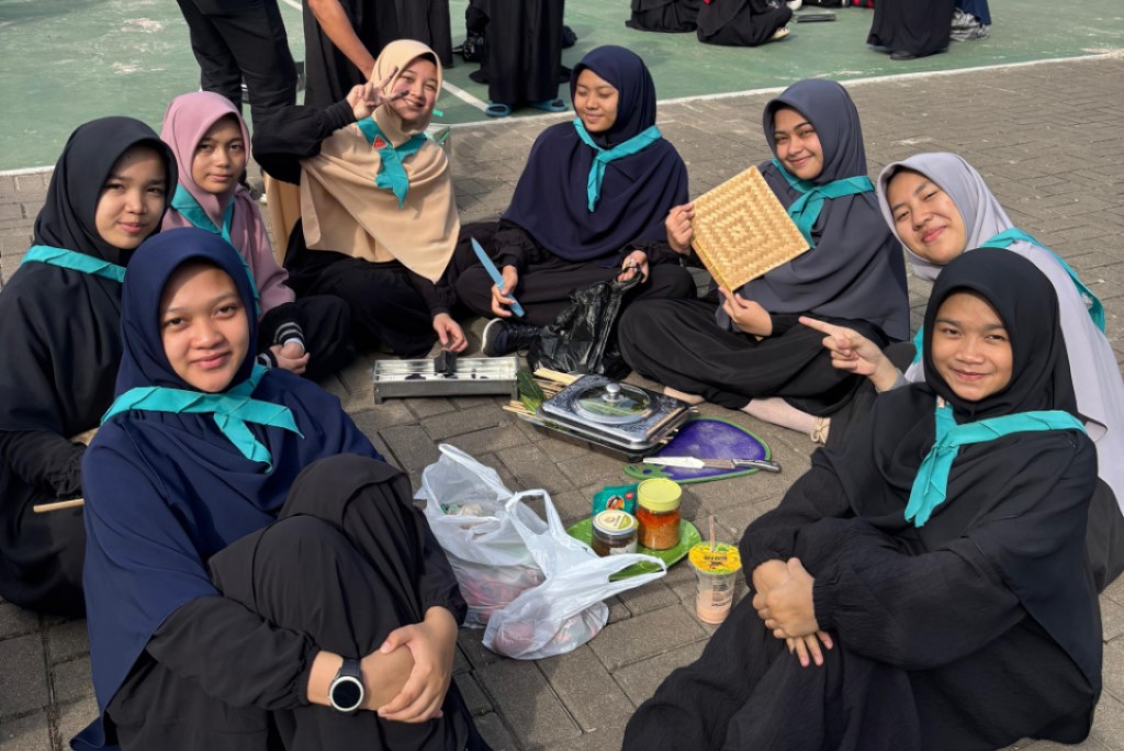 Potret santri SMK DTBS Putri sedang berkumpul dalam pelaksanaan lomba nyate Sekolah Daarut Tauhiid Indonesia (SDTI) pada (9/6/2025) di Lapangan SMP DTBS Putri, Jl. Gegerkalong Girang Baru, Kota Bandung.