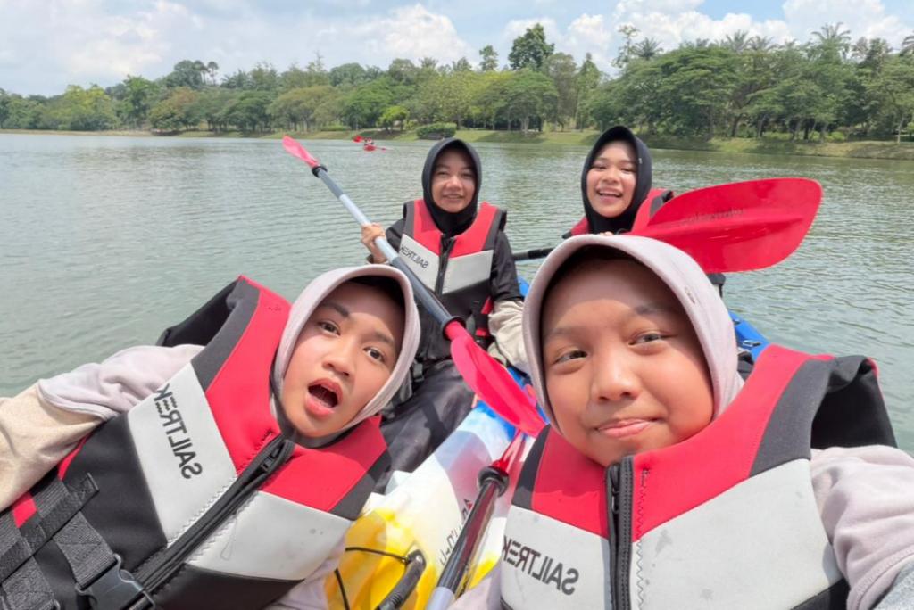 Potret saat santri SMP Daarut Tauhiid Boarding School (DTBS) Putri yang mengikuti program Malaysia Immersion bermain kayak, Ahad (12/4/2026).