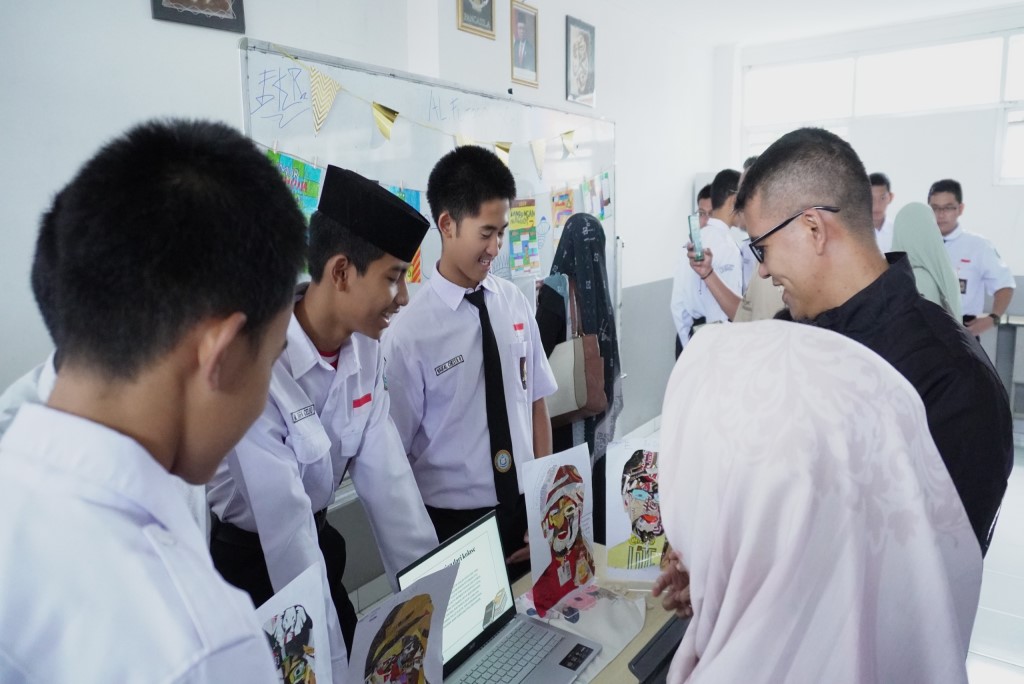 Potret perwakilan santri SMA DTBS Putra menjelaskan karyanya kepada orang tua saat sesi Gelar Karya pada (14/12/2024) di Ruang Kelas Belajar, Gedung SMA DTBS Putra, Jl. Cigugur Girang, Kab. Bandung Barat.