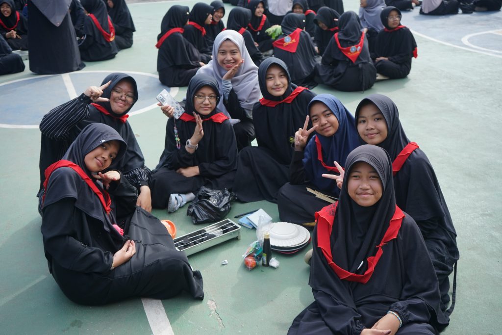 Potret santri SMP Daarut Tauhiid Boarding School (DTBS) Putri saat ikut memeriahkan semarak Idul Adha melalui kegiatan nyate bareng, yaitu memasak dan menikmati sate dari daging qurban yang telah dibagikan. Kegiatan ini berlangsung di Lapangan Sekolah, pada Senin (9/6).