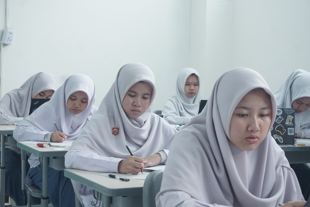 Kegiatan Penilaian Sumatif Tengah Semester (PSTS) untuk kelas X dan XI, serta Ujian Diniyah untuk kelas XII SMA DTBS Putri yang berlangsung di Ruang Kelas Belajar, pada Senin (3/3).