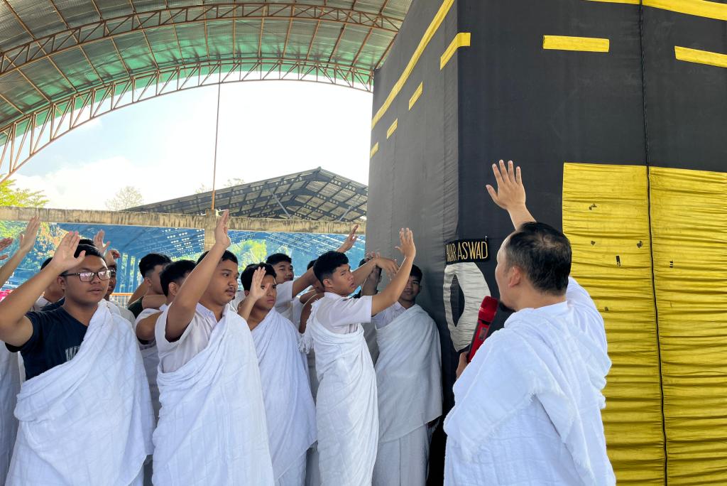 Potret saat santri kelas XII TJKT dan XII BP SMK Daarut Tauhiid Boarding School (DTBS) melaksanakan Ujian Praktik Manasik Haji bersama Ust. Dr. Mulyadi Al Fadhil, M.Pd., di Kampus 2 Eco Pesantren, Selasa (14/4/2026).